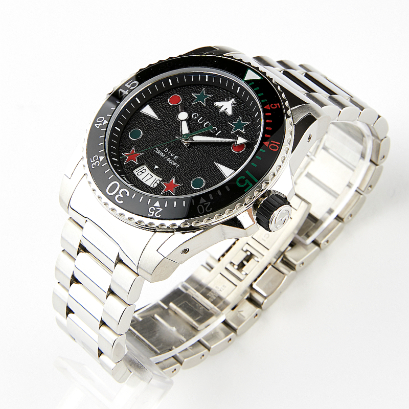 안녕하세요^^구찌시계 한국본사 공식판매처 타임플라자입니다.타임플라자의 모든 구찌시계는 전국 백화점 구찌시계 매장에서 AS 접수가 가능한 정품입니다:)남성적인 매력과 세련된 스타일 모두 연출되는 구찌의 DIVE 다이브라인 모델은 그 매력 때문에 꾸준히 인기가 있었습니다:) 구찌 DIVE라인의 새로운 신모델이 출시되었습니다.구찌의 시그니처 컬러인 그린,블랙과 하우스코드별 벌무늬가 인덱스로 디자인된 매력적인 다이브 모델 신형입니다^^